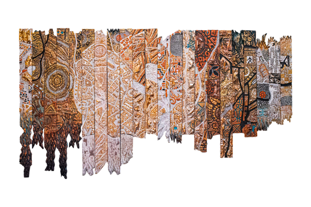 Uneven, roughened wood strips with bitten edges like leftovers from an ants food feast, coming together in one piece. Tan brown, dark brown, wood earth, gold tones, orange hues,  and several shades of brown and red highlight the composition. There are no identifiable images across the wood panel, but very intricately driven into each strip of wood are patterns and motifs flowing from one strip into the other to make the complete panel.