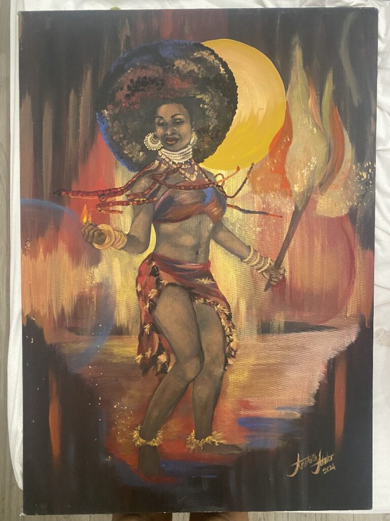 In all, Aletor’s ‘Woman and Passion’ series is a visually striking exploration of femininity, and tradition. While the series successfully captures the essence of passion and celebrates cultural identity, the refinement of certain formal elements may have enhanced the overall impact. The layering of vibrant yet muted colours however, complements each composition, grounding the figure in a dreamy, culturally rich world. According to the artist, the background is a misty blend of warm and cool hues that signify the warmth of the earth and the cool of water. This marked disparity lends a spiritual dimension, suggesting a balance between worlds. Her treatment with colour and soft modelling in the figure’s blue-grey skin tones imbues it with an almost otherworldly presence, while the glowing drum draws attention to the source of her passion. The third work in the series is remarkable for the sheer intensity of light. The figure bears a torch, and her movement seems to symbolise dance, energy, and power. Dressed in traditional attire, and adorned in an Afrocentric hairstyle and bold jewellery, she radiates confidence and strength. The warm, fiery reds, yellows, and oranges of the flames are especially compelling. Along with the sun-like orb convey motion and intensity, they serve as a powerful metaphor for the inner fire that drives passion. Therefore, this third painting serves in celebrating culture while capturing the passion and primal energy of womanhood. Conversely, the softer, dreamlike blues and purples in the first and second paintings of the same series evoke serenity and reflection.