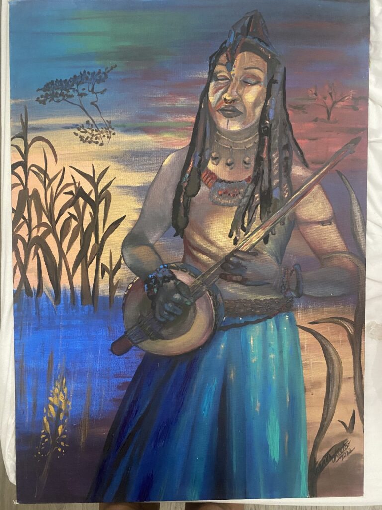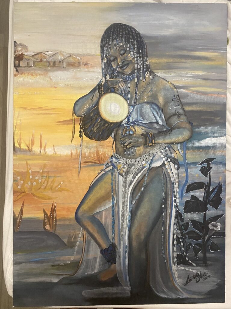 Importantly, the three paintings are united by a common thread of elements, chief among these is colour. Anehita Aletor’s manipulation involves the blending of warm, earthy tones with cool, soothing hues to create a balanced atmosphere. Another shared element is the use of African motifs such as musical instruments, hairstyles, beads and clothing. Together they speak to an inner world. Symbols of nature including fire are also common to all three works; they add depth and root each piece. Anehita Aletor seems to intentionally integrate these elements to evoke a sense of the ritual, at once connecting with a cultural narrative that elevates the subject matter beyond portraiture to offer more insight into the spiritual and creative lives of women. The women here are not just individuals but representatives of broader cultural experiences. Consequently, the paintings offer a visual journey that celebrates both the personal and collective experiences of women, framed by a rich tapestry of tradition and modern expression.