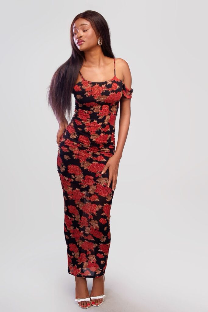 Ranto Clothings’ Flow collection has a youthful, playful charm that comes through beautifully in the floral bodycon dress featured. The bold red-and-black print brings energy and confidence, and the fitted silhouette highlights the natural curves of the wearer in a flattering way. The off-shoulder strap detail adds a touch of asymmetry that keeps the look interesting and modern.